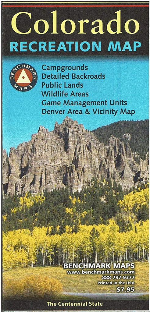 The Colorado Recreation Map is a folded map version of the Recreation Guide pages within Benchmark Maps' Colorado Road & Recreation Atlas. One side provides a full state map that features Public Lands, extensive highway detail, point-to-point mileages, recreation attractions, campgrounds, parks and wildlife areas, fishing access points, and hunting units (GMU). The reverse side includes a Denver vicinity map and categorized recreation listings with helpful descriptions, current contact information, and map grid references.
