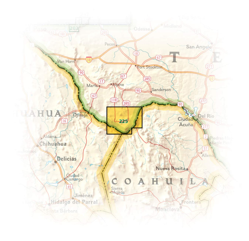 Other features found on this map include: Big Bend, Boquillas Canyon, Chalk Mountains, Chilicotal Mountain, Chisos Mountains, Christmas Mountains, Dagger Mountain, Emory Peak, Ernst Valley, Mesa de Anguila, Rosillos Mountains, Sierra del Carmen, Stairway Mountain, Sue Peaks, Terlingua Creek.