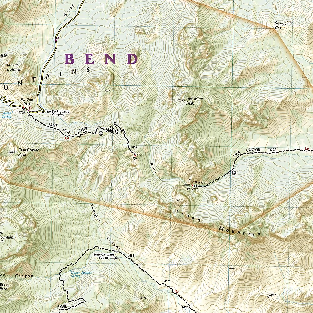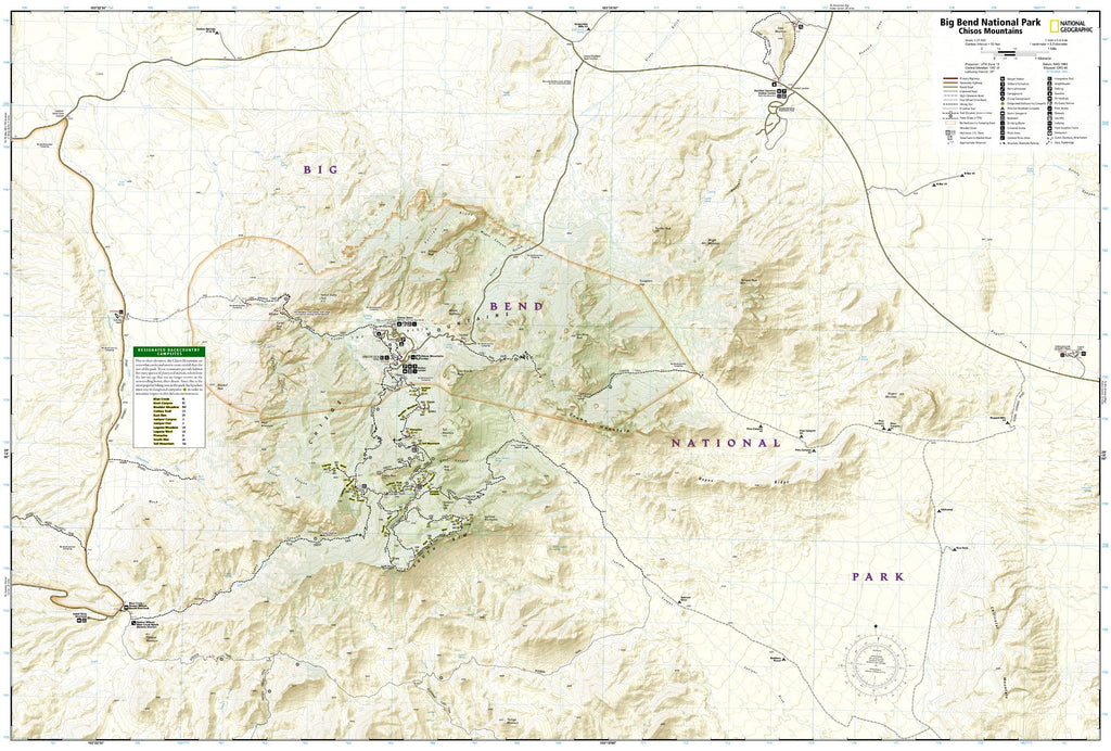 Hiking and primitive trails are clearly marked and the Chisos Mountains detail provides mileages between intersections. Road types are differentiated, so you know if the route you choose is a paved, dirt, four-wheel-drive, or high-clearance road. River mileage on the Rio Grande is noted as well, for those exploring by boat. The map base includes contour lines and elevations for summits. Helpful information about backcountry use, regulations, wildlife, and safety tips combined with a chart showing the location of designated backcountry campsites will prove invaluable in your exploration of the park. Other recreation features noted are campgrounds, picnic areas, points of interest, scenic viewpoints, interpretive trails, and lodging.