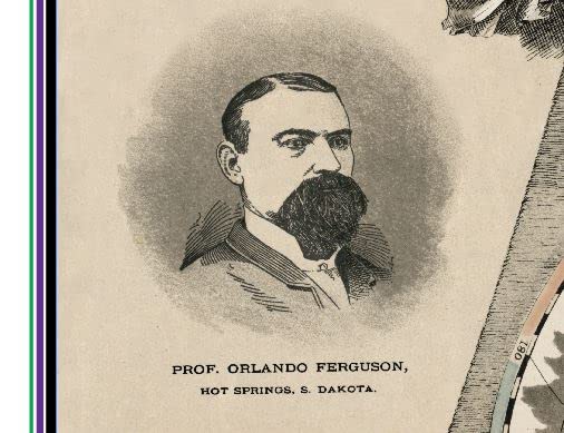 Professor Orlando Ferguson was born on November 6, 1846, near Du Quoin, Illinois, & moved to the Dakota Territory in the early 1880s to later settle in Hot Springs, South Dakota. He’s most known today for his rendering of a map depicting the earth as being flat. The map was published in 1893, 1 year after the more famous Alexander Gleason New Standard Map of the World was published (1892). Ferguson’s recent rise in cartographic popularity is credited to the press attention that was received when a copy of his “Map of the Square and Stationary Earth” was accepted by the Library of Congress in 2011.