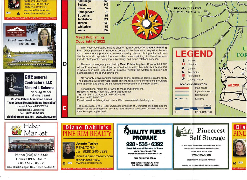 Atop the Mogollon Rim are the twin communities of Heber and Overgaard, Arizona. At 6,500 feet, the air is a little thinner and a whole lot cooler than the desert below. The obverse map shows all of the streets and development names, with a handy street index adjacent. It also features a legend, a mileage chart, and an Arizona inset map featuring the Interstate, U.S. highways, and state highways. The reverse Heber-Overgaard Vacation Map is a watercolor illustration of the greater region highlighting the various nearby recreational opportunities.