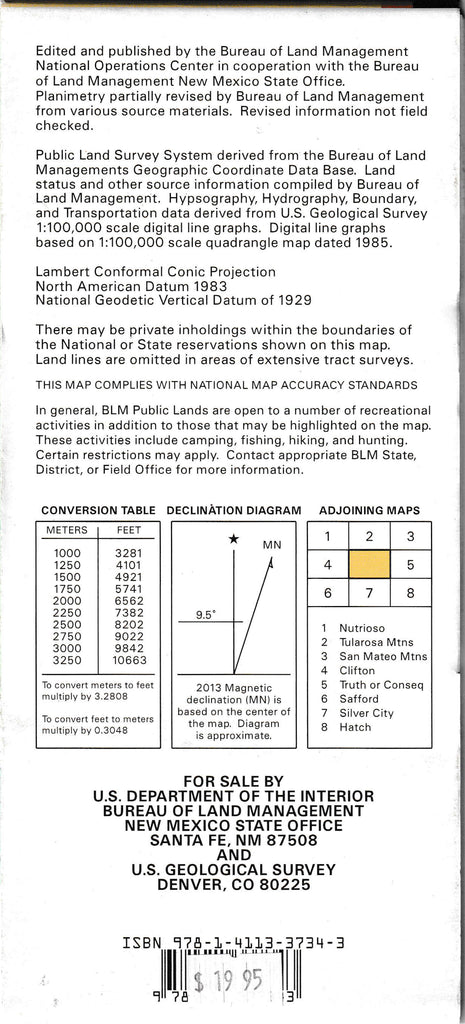 Official Bureau of Land Management topographic maps @1:100,000 metric scale (roughly 3/4" = 1 mile), are color-coded to show federally-managed public lands; plus state, private, or tribal lands, military withdrawals, roads and trails, lakes, rivers and streams, and developed recreation areas. This is a great map to have while stalking game in Hunting Units 16A, 16B, 16C, 22, 23, or 24, fishing, wildlife watching, hiking, backpacking, mountain biking, camping, or OHV and ATV riding. This map includes roads and lands in Catron and Grant Counties and shows much of the Gila Wilderness Area of the Gila National Forest.