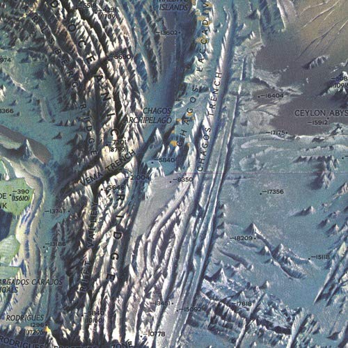 This incredibly distinctive physical map of the Indian Ocean floor appeared in the October 1967 issue of National Geographic, and details submarine terrain such as continental shelves, basins, fracture zones and the mighty Mid-Oceanic Ridge. Explore the depths of the lowest crevices and see how the land masses rise up above the waves.