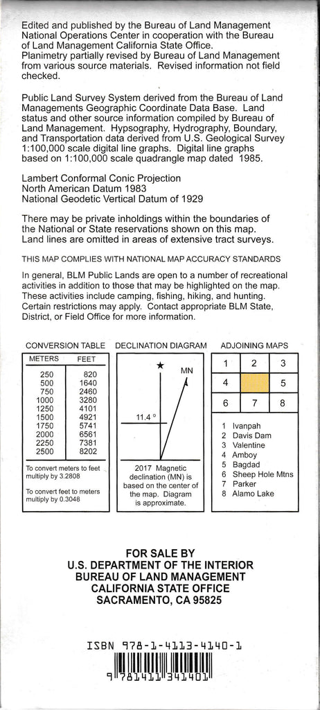 In Arizona map shows expansive BLM lands with camping, hiking, OHV driving, and scenic driving opportunities; Havasu National Wildlife Refuge with camping, hiking, boating, and fishing; and Needles Wilderness with hiking trails; all east of the Colorado River. From Needles, CA, explore extensive BLM lands and BLM wildernesses with opportunities for hiking, horseback riding, 4-wheel driving, and rock collecting. Colorado River recreation includes boating and fishing. Official Bureau of Land Management metric topographic map @1:100,000 scale (roughly 3/4"=1 mile), color-coded to show surface management, i.e. agency vs. private or tribal ownership. The map shows roads, water features, recreation sites, points of interest, and the township and range lines. Maps show trails, roads, and developed recreation areas such as campgrounds. The backside of the map has extensive information about the designated 25 million-acre California Desert Conservation Area. Includes descriptive information about the places on the map, along with available recreational activities such as camping, hiking, horseback riding, and 4-Wheel/OHV driving. Use map for California Deer Hunting Units D12 and D17, and Arizona Hunting Units 16A, 16B, and 15D.