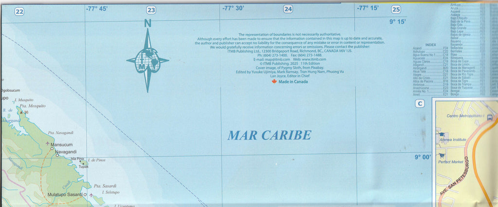 The Central American country of Panama is actually an east-west country, not a north-south one as one might expect. Its historic claim to fame is two-fold. It was here that Spanish conquistadors first set eyes on the vast Pacific Ocean, and it is here that much of the world's commercial goods pass from the Pacific to the Atlantic. The Canal is extremely important, and a "must see" attraction, but the country offers much more. Santa Catalina is a world-class surfing destination. The Pearl Islands feature virgin forest and pristine beaches. Boquette, in the northern mountains, is the valley of the flowers. Panama City is a vibrant economic centre for shopping. In recent years, Panama has invested heavily in tourism. The roads are excellent, the people are friendly, the restaurants are excellent, and the country is peaceful. This is a very up-to-date edition of Panama, complete with excellent inset maps of Panama City and of the canal area (we also publish the Canal region as a separate map). As previously, this edition is printed on durable waterproof stone paper, ideal for use in the tropics.