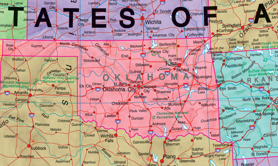 This map of the United States of America is a political map & flag chart all in one! It features bright pastel tones for states which have themselves and other political features clearly labeled. The oceans have a lightsea parchment tone to help the landmasses standout.