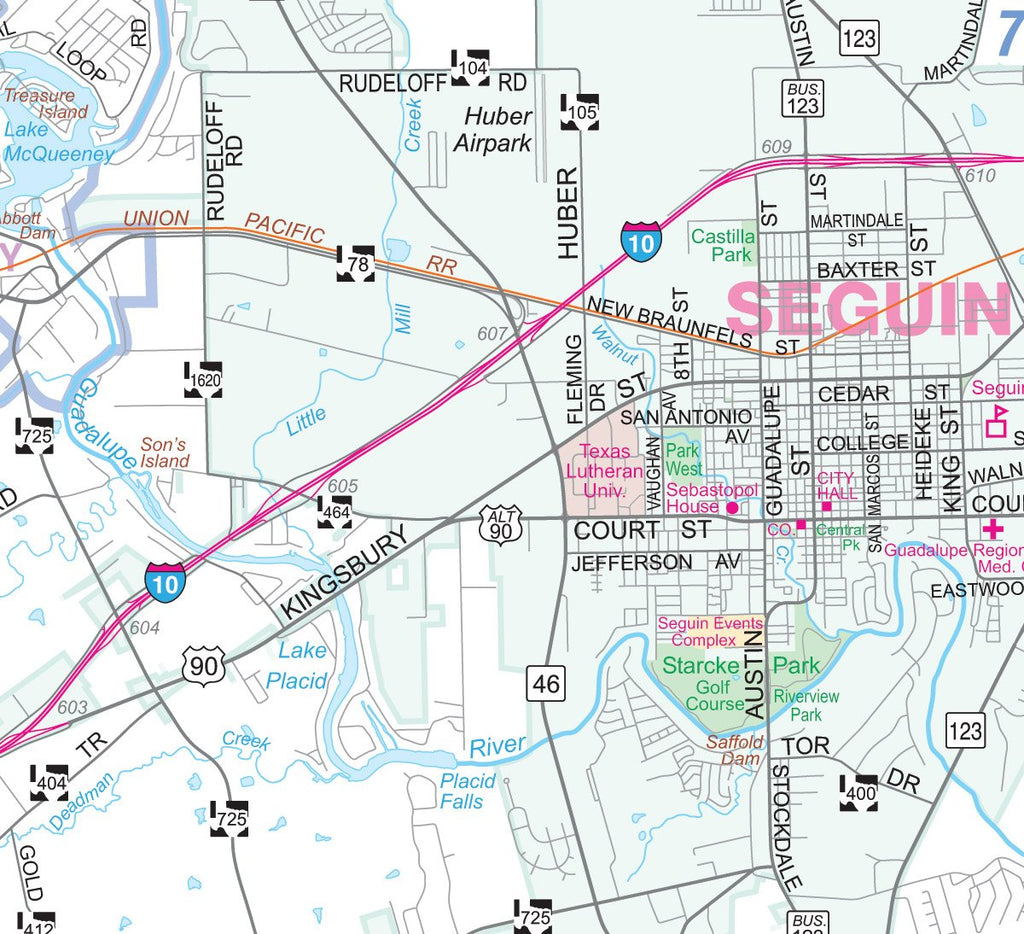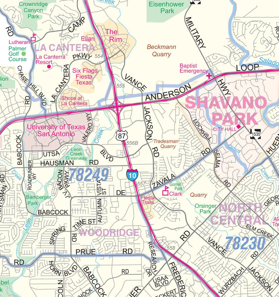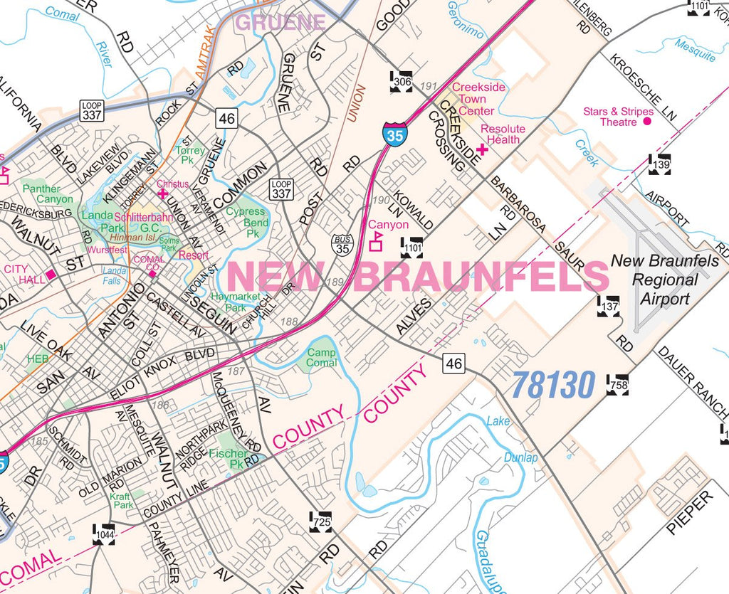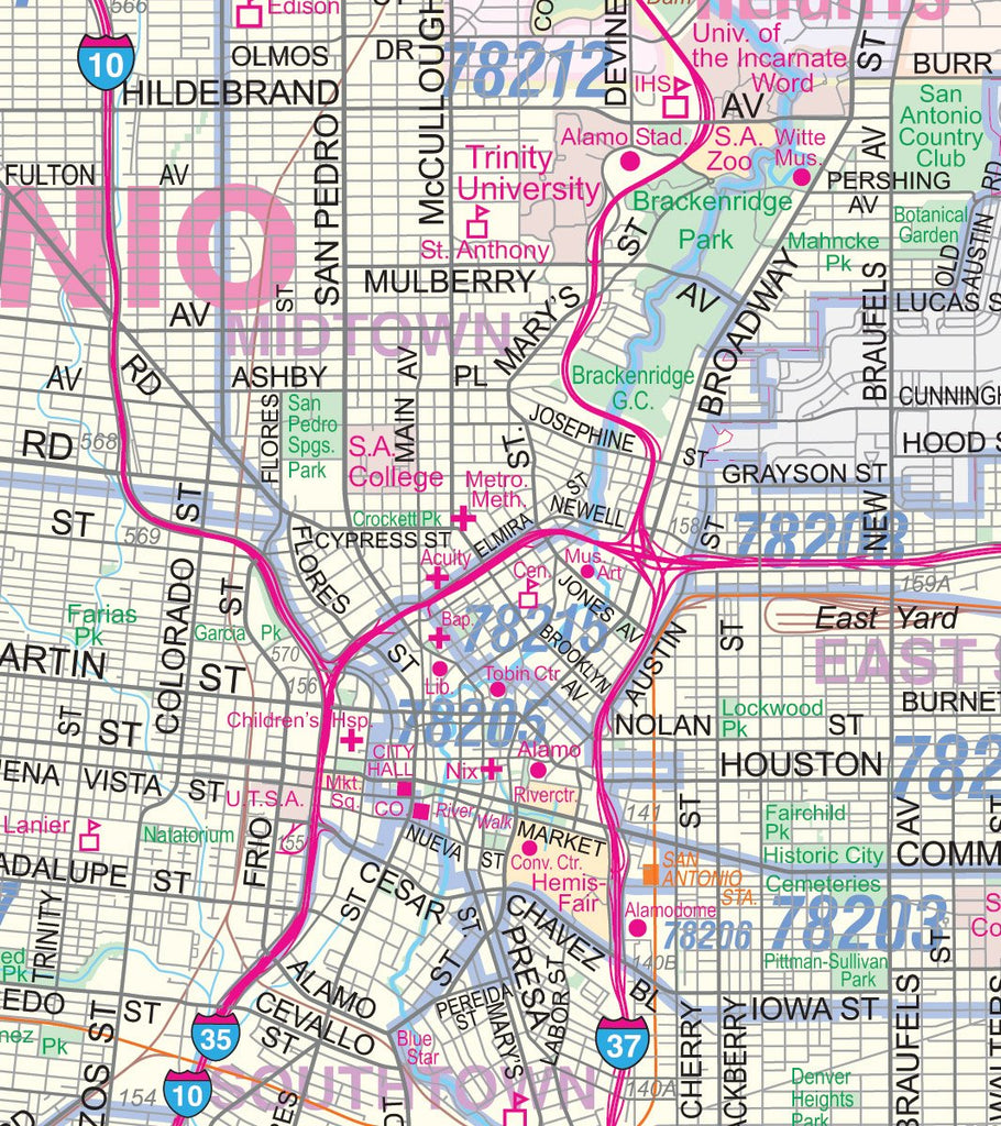 New for 2018 - This 36" x 48" wall map offers a unique combination of coverage and detail at a nice price! Coverage includes booming Bexar County and adjacent areas, from Boerne to Sandy Oaks and Castroville to Seguin. Comprehensive and updated detail showing every street, with all major roads labeled - including 'Farm to Market' county designations. All freeways (with exit numbers), toll roads, airports, passenger and freight rail lines, hospitals, colleges, parks, high schools, major points of interest, rivers, major terrain features, and current zip codes are all clearly indicated. Laminated and ready to ship!