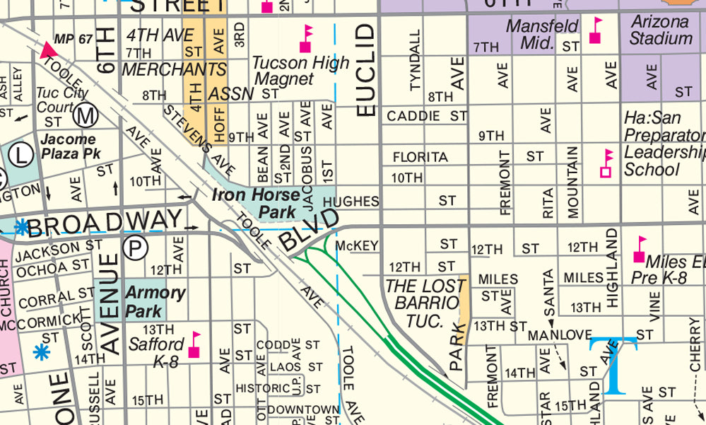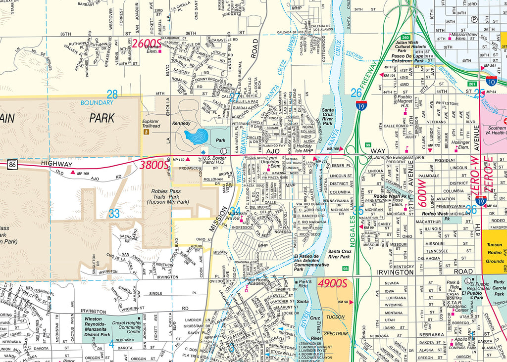 This completely updated color full detail wall map was prepared with digital accuracy and displays impressively on any wall. An excellent tool for any business needing a detailed view of the central corridor. The map's boundaries are Ina Road on the north, Old Vail Connection Road on the south, Camino De Oeste on the west, and Wilmot Road on the east.