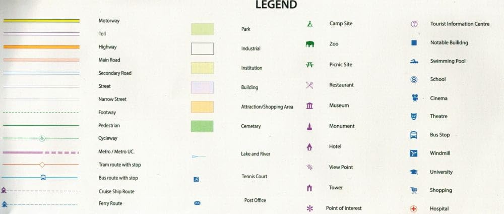 - Legend Includes: Roads by classification, Rivers and Lakes, National Park, Airports, Points of Interests, Highways, Main Roads, Zoos, Fishing, and much more...