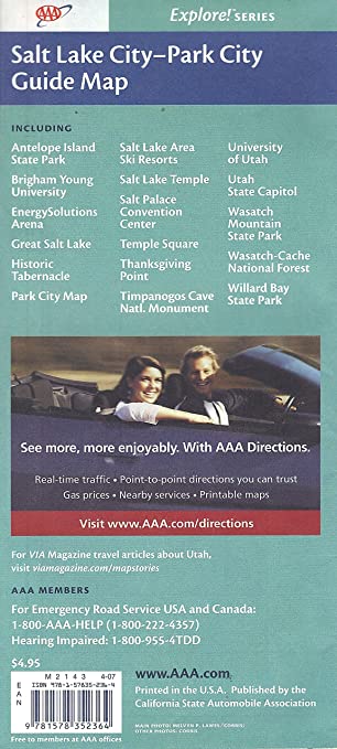 Salt Lake City - Park City Guide Map is part of the Explore! series by AAA. It is a map plus descriptions of points of interest in Salt Lake City and the Greater Salt Lake Area, winter sports areas, museums, and more. Maps included are Salt Lake City and Vicinity, Central Salt Lake, Downtown Salt Lake City, and Park City. Places covered include Antelope Island State Park, Great Salt Lake, Historic Tabernacle, Salt Lake Area Ski Resorts, Salt Lake Temple, Salt Palace Convention Center, Temple Square, Temple Square Area, Thanksgiving Point, Timpanogos Cave National Monument, Utah State Capitol, Wasatch Front, Wasatch Mountain State Park, Wasatch-Cache National Forest, and Willard Bay State Park.