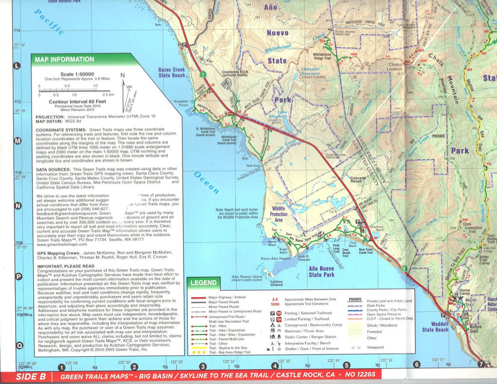 Hike, horseback, or walk Skyline to the Sea Trail, Castle Rock, Big Basin State Park, Castle Rock State Park, Butano State Park, Año Nuevo State Park, and Pescadero Creek County Park. Printed on a rugged, waterproof, tear-resistant, ultralight sheet with boots on the ground accuracy. Field mapped by Green Trails crews. Solar powered; no batteries required!