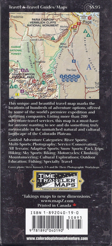 This unique Travel Map and Directory marks the locations of hundreds of adventure options for the Colorado Plateau area, including Grand Canyon National Park, Paria Canyon-Vermilion Cliffs National Monument, and Kaibab Plateau. Lists more than 200 adventure and travel services for river sports, photography, all-terrain, snow sports, pack trips, hiking, biking, climbing, motorcycles, cultural exploration, outdoor education, and fishing.