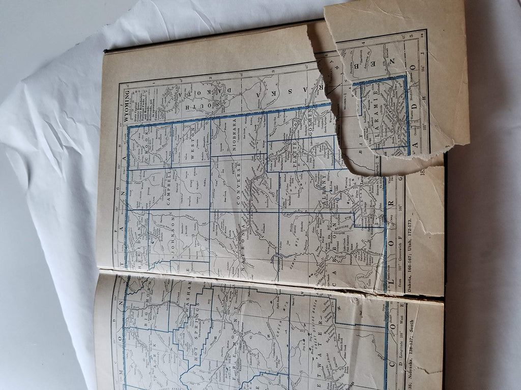 Black cover, undamaged spine, wear on corners. Pages show its age, Wyoming has torn page (see photo) Gazette info on countries, states, etc.